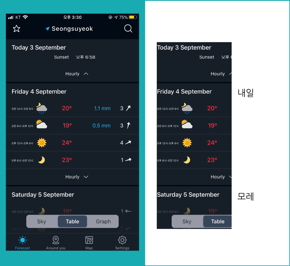 저는 주로 표로 보기가 편하더라고요. 현재 기온부터 앞으로 6시간 후, 내일모레 등 미래의 날씨를 간결하게 볼 수 있어요.